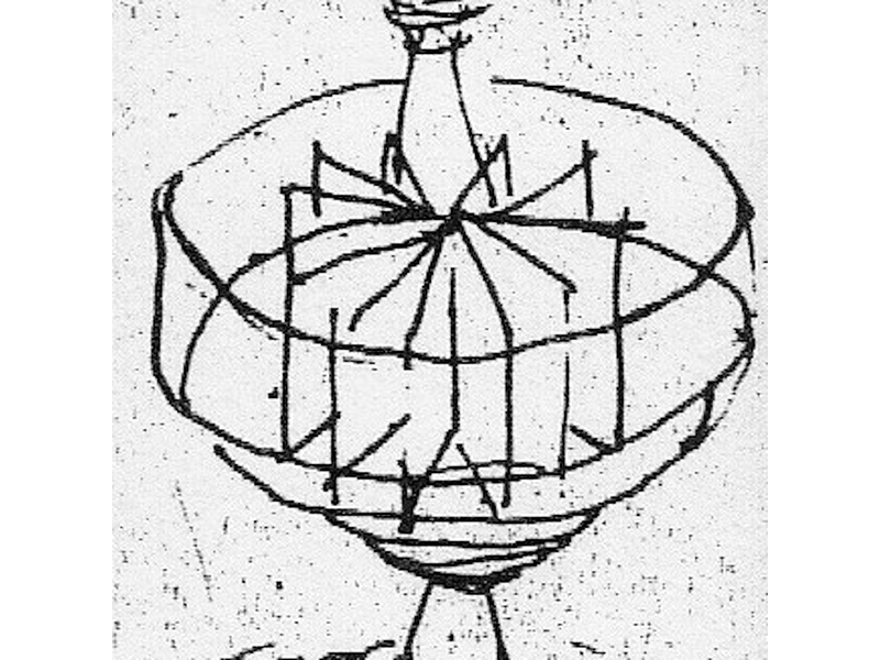 - Acquired by University of Pennsylvania’s Department of Rare Books and Manuscripts, Van Pelt - Dietrich Library with assistance from the Alumni and Friends Memorial Book Fund. Portfolio N7433.4.K575 R43 1997b Work: The Reading Chamber (#0 of 11). This version of The Reading Chamber is described in the catalog as follows: “Eight laminated leaves attached by wire to a central, pivoting metal hinge, which is, in turn, attached to copper tubes at top and bottom, which are fixed to ceiling and floor, allowing the book, suspended at approximately eye-level for a standing reader, to be circumnavigated by spinning the text-pages.” Also noted: “one laminated leaf [has] detached from [the] central hinge.”