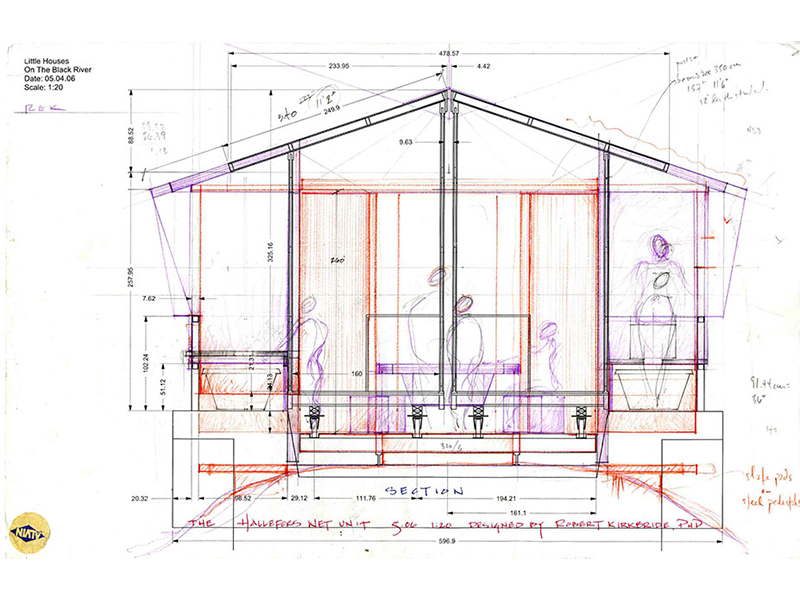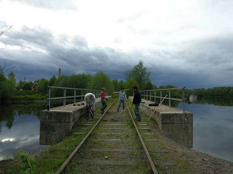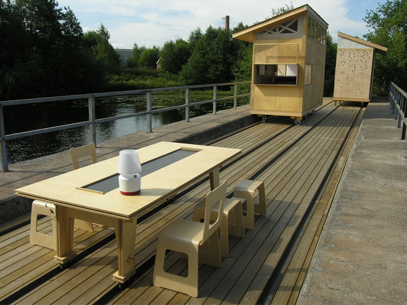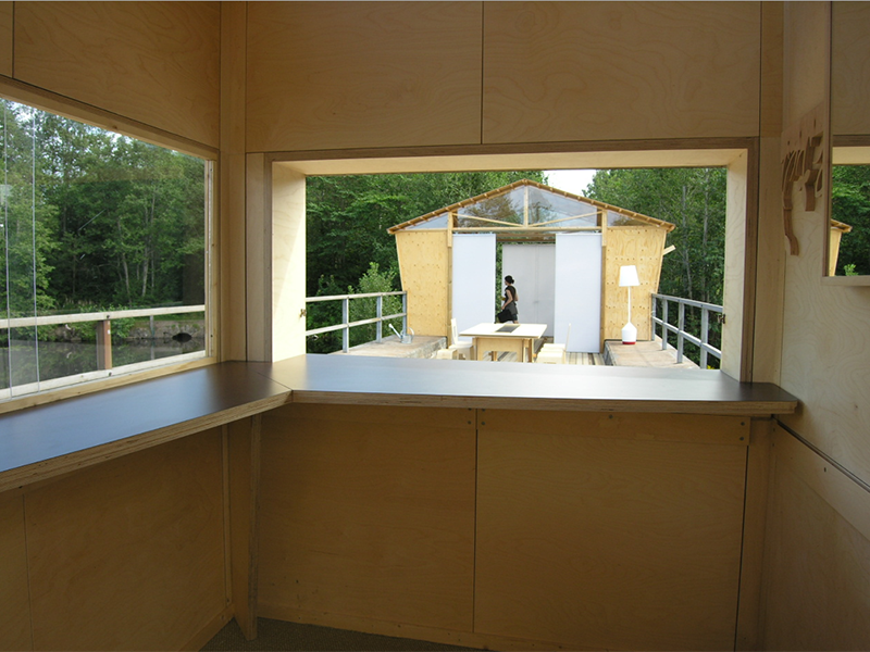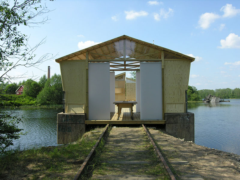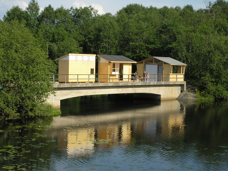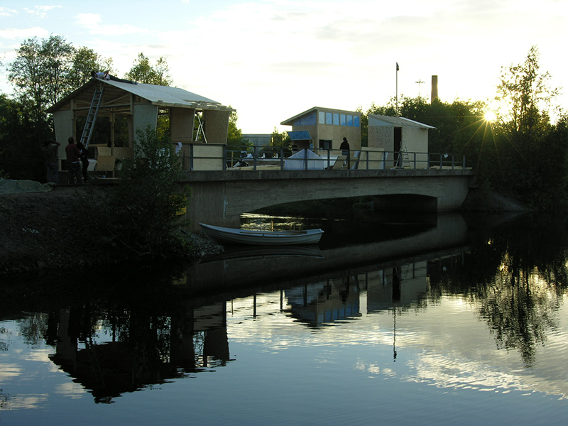 Conceived as a collaboration among students and faculty from Parsons, Konstfack and St. Etienne, Little Houses on the Black River was developed across the 2005-06 academic year to explore potentials of sustainable shelter. In need of temporary housing for designers, scholars and visitors, the House of Design (Formens Hus) sponsored a proposal by Tony Whitfield (Chair, Parsons BFA Product Design) and Lars Wieselgren (Manager, Formens Hus) to design and construct seasonal dwellings on a former industrial railway bridge over the Black River. This site offers visitors a reminder of the town’s industrial heritage, while serving as a model for the adaptive reuse of existing infrastructure. The existing bridge and its rails also provided a ready-made foundation for the new dwellings, minimizing the ecological impact of construction.