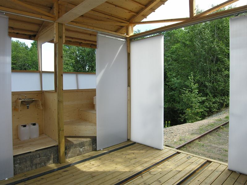 A third structure, the Hällefors Gatehouse, or “wet unit,” provided residents with a 10m2 shared kitchen, dining/work area, shower and a waterless Danfo toilet. This structure was designed by me, based on a program determined with students and faculty in an intensive design-build timeline. The three structures and their supporting deck, built directly onto the existing rails, were installed in ten days by Parsons faculty and staff. As such, the project pursued the notion of sustainability in a zone between traditional practices of architecture and product design, through an integration of “universal” product and immediate context (site and cultural memory), with the aim to unite regional wisdom with global concerns.