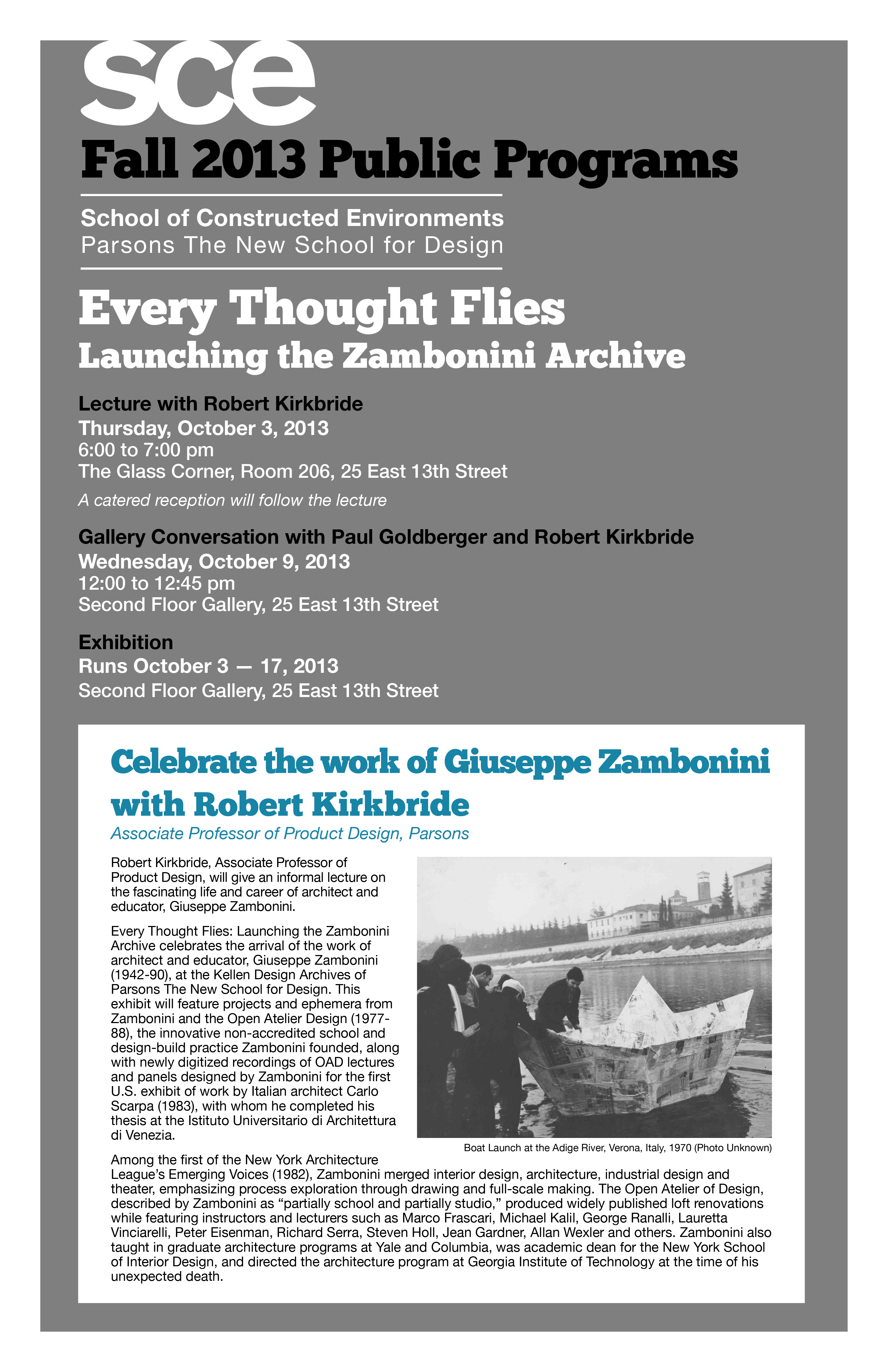 Through an exhibit and lecture entitled, “Every Thought Flies: Launching the Zambonini Archive,” and a subsequent conversation with Paul Goldberger, we formally celebrated the archive’s arrival at Parsons and The New School. The exhibit featured projects and ephemera from the permanent collection produced by or related to Zambonini and the Open Atelier Design, along with newly digitized recordings of OAD lectures and the panels of the Scarpa exhibit.